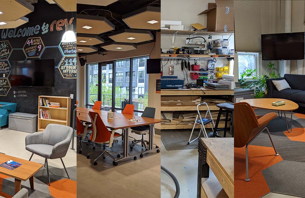 Four office scenes from Rev: Ithaca Startup Works featuring the waiting area, workspaces, and the hardware accelerator workshop.