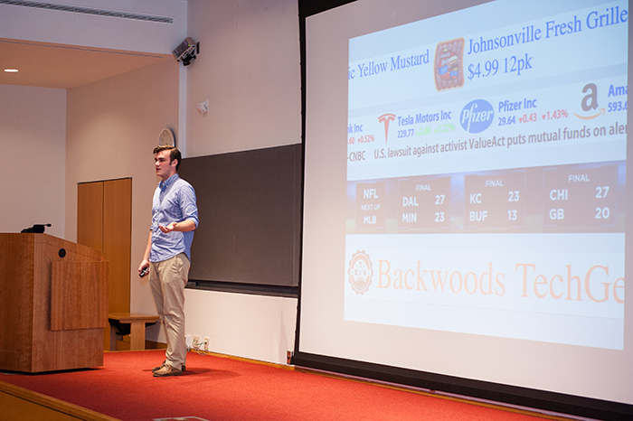 Demo Day includes a pitch for each team’s prototype; shown here is Cameron Burbank with ProjecTicker.