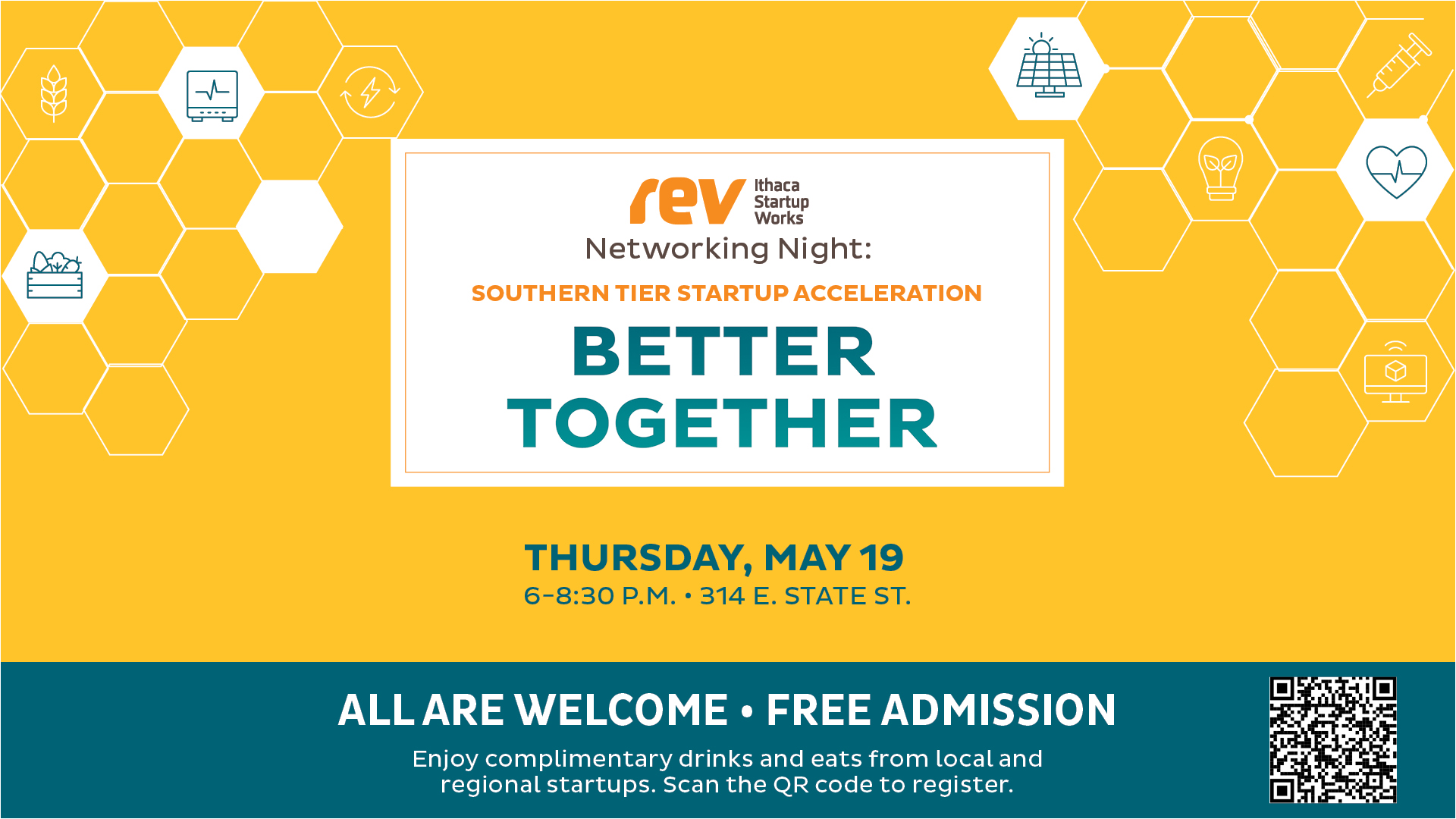 Networking@Rev: Better Together Thursday, May 19, 2022 (6:00 - 8:30 pm. ET) at Rev: Ithaca Startup Works   The Southern Tier is a rich environment for startups working across a diverse array of sectors, including clean tech, ag tech, food tech,… Read more Networking@Rev: Better Together
