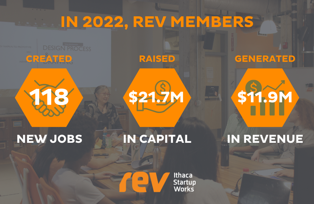 Rev: Ithaca Startup Works is proud to announce that throughout 2022, Rev member startups created 118 new high-quality, local jobs, raised $21.7 million in capital, and generated $11.9 million in revenue. These numbers top the list of Cornell University’s 2022 Local Economic Impact Snapshot, as Rev continues to be a local leader in economic development and entrepreneurial innovation.
