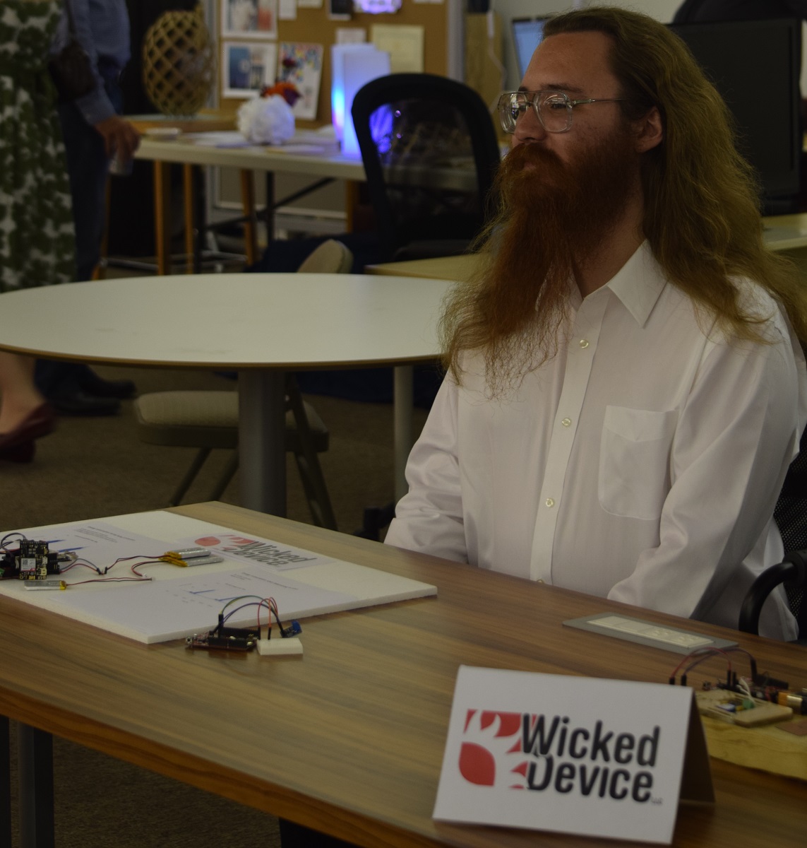 Vel Pendell of Wicked Device showing off the Pallet Tracker prototype.