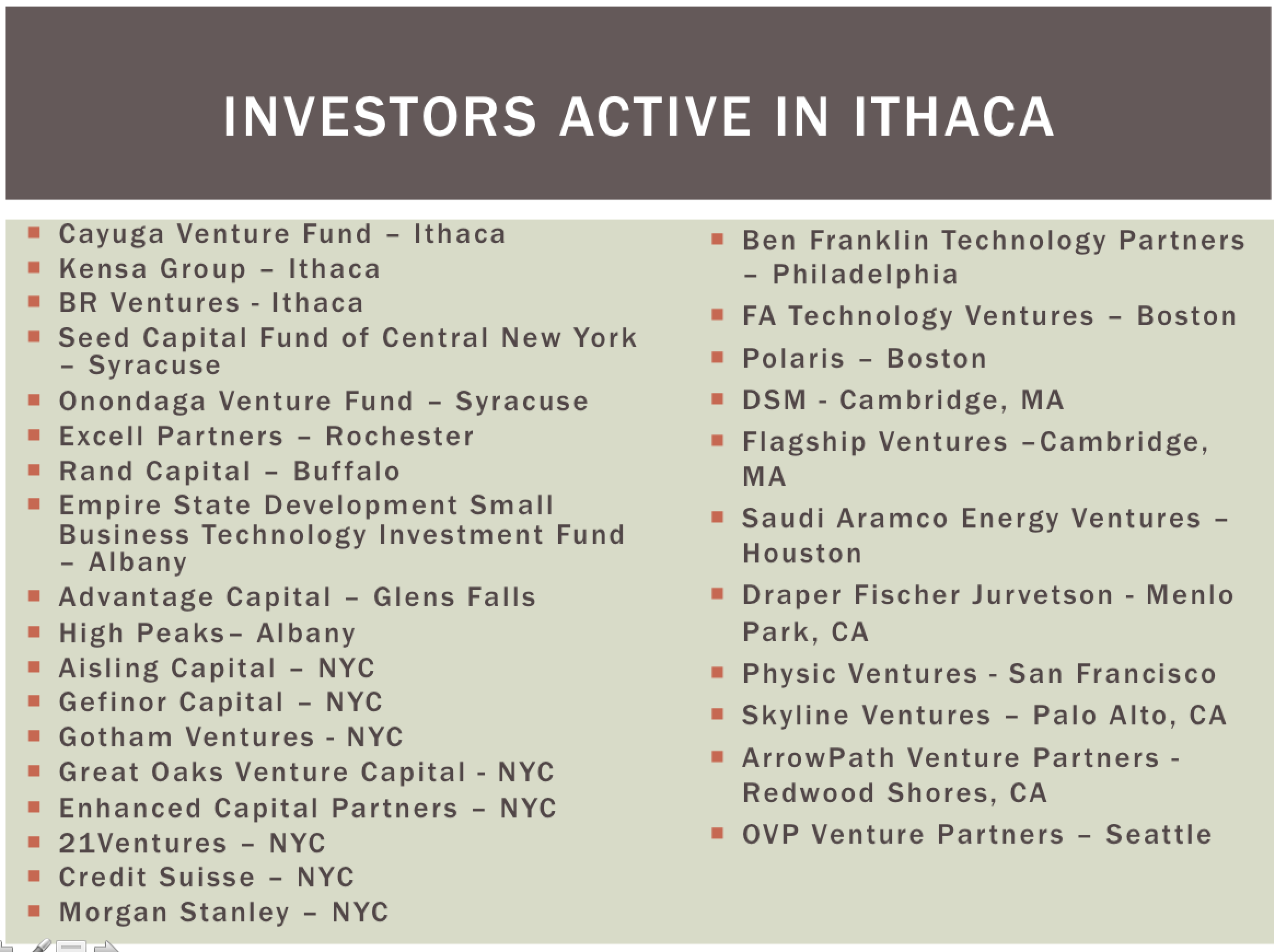 Venture Capital firms that have invested in startups based in Ithaca New York